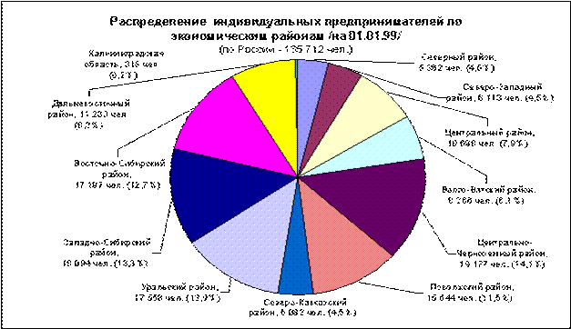 Число индивидуальных предпринимателей, зарегистрированных органами статистики, к началу 1999 года составило порядка 136 тыс. человек (см. диаграмму 7). Однако, по оценке специалистов Госкомстата России, фактически их в 5-6 раз больше. В органах статистики зарегистрированы по преимуществу индивидуальные предприниматели, ведущие внешнеэкономическую деятельность.