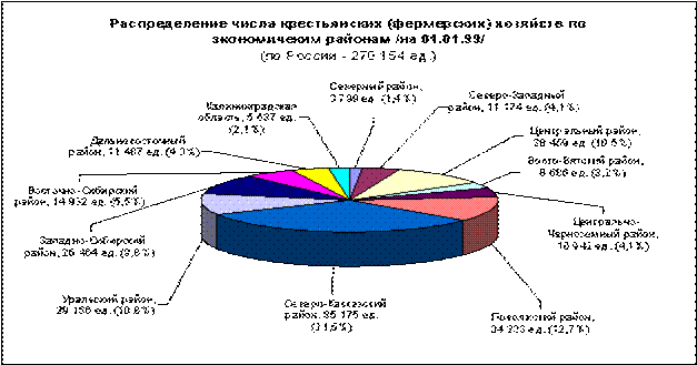 Общее число крестьянских (фермерских) хозяйств к началу 1999г. составило 270 тысяч (см. диаграмму 8). Почти треть из них сосредоточены в Северо-Кавказском районе.