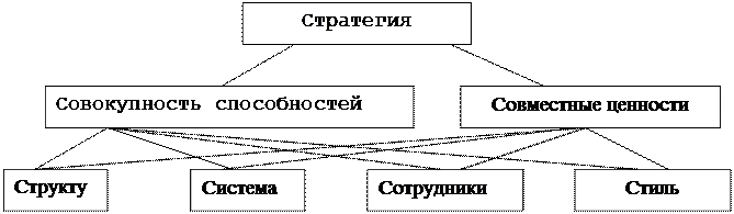 Таким образом, в долгосрочном плане отражается главным образом общая стратегия фирмы и описывается модель будущего с позиций весьма широкого подхода. В качестве единой стратегии развития фирмы сейчас может быть взята так называемая модель-7С, характеризующая механизм взаимодействия таких важнейших социально-экономических факторов, как структура, система, сотрудники, стиль, совместные ценности и совокупность способностей (рис. 2).