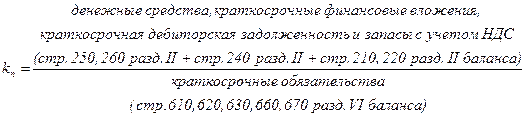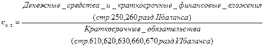 2.Коэффициент абсолютной ликвидности, показывающий, какую часть краткосрочной задолженности может покрыть организация за счет имеющихся денежных средств и краткосрочных финансовых вложений, быстро реализуемых в случае надобности. Показатель рассчитывается по формуле: