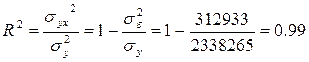 Показатель R2 называется коэффициентом детерминации. Он выражает долю факторной дисперсии в общей дисперсии, т.е. характеризует, какая часть общей вариации результативного признака у объясняется изучаемым фактором х.
