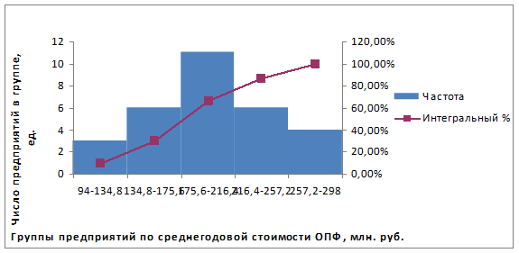 Распределение предприятий по группам носит закономерный характер. В совокупности преобладают предприятия со стоимостью основных фондов в пределах от 175,6 до 216,4 млн. руб.: 11 предприятий из 30.