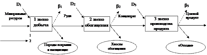 1 – направления потоков минерального вещества; 2 – направление потока дополнительного сырья, материалов, продуктов; β – количество выбросов исходного сырья в атмосферу; D – дополнительное сырье.