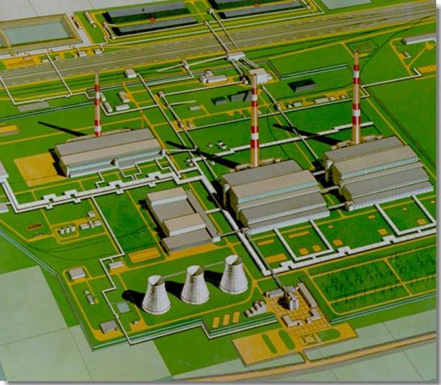 Компоновка главного корпуса – модульная (2 модуля по 4 котлоагрегата, 2 турбоагрегата). У каждого модуля предусмотрена дымовая труба (высота 300 м, диаметр устья 7,8 м) и отдельный ввод для подачи топлива. Для очистки дымовых газов от золы у каждого котла предусмотрены два электрофильтра типа ЭГБМ2-48-12-6-6.