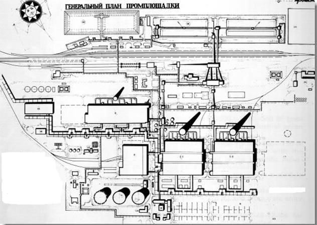 Источники выделения и источники выбросов в атмосферу загрязняющих веществ проиллюстрируем на генеральном плане промплощадки ТЭЦ-1.