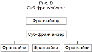 В суб–франчайзинге суб–франчайзер также осваивает какую–то определенную территорию и обеспечивает первоначальное обучение, выбор помещения и т. д. Разница только в том, что франчайзи работает напрямую с суб–франчайзером на долгосрочной основе и имеет очень ограниченный контакт с франчайзером. Он платит роялти и рекламные взносы суб–франчайзеру, который, в свою очередь, часть этих денег платит франчайзеру. Суб–франчайзер, таким образом, становится франчайзером на своей территории и франчайзи зависит от его долгосрочной поддержки. То, что суб–франчайзер может иметь не ограниченные средства, управленческие и маркетинговые способности, отразится на франчайзи. Следовательно, потенциальный франчайзи должен очень тщательно выбирать суб–франчайзинговые отношения, так как он зависит от деловой и жизненной хватки как франчайзера, так и суб–франчайзера.