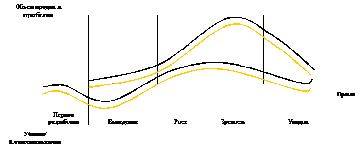 Жизненный цикл товара – изменение объема продаж и прибылей на протяжении времени его жизни.