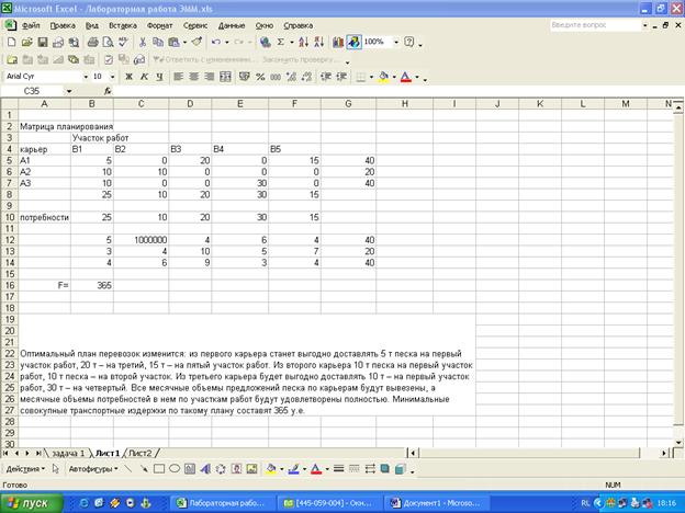 Оптимальный план перевозок изменится: из первого карьера станет выгодно доставлять 5 т песка на первый участок работ, 20 т – на третий, 15 т – на пятый участок работ. Из второго карьера 10 т песка на первый участок работ, 10 т песка – на второй участок. Из третьего карьера будет выгодно доставлять 10 т – на первый участок работ, 30 т – на четвертый. Все месячные объемы предложений песка по карьерам будут вывезены, а месячные объемы потребностей в нем по участкам работ будут удовлетворены полностью. Минимальные совокупные транспортные издержки по такому плану составят 365 у.е.