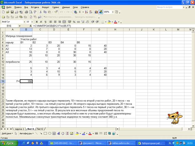 Компания, занимающаяся ремонтом автомобильных дорог, в следующем месяце будет проводить ремонтные работы на пяти участках автодорог. Песок на участки ремонтных работ может доставляться из трех карьеров, месячные объемы предложений по карьерам известны. Из планов производства ремонтных работ известны месячные объемы потребностей по участкам работ. Имеются экономические оценки транспортных затрат (в у.е.) на перевозку 1 тонны песка с карьеров на ремонтные участки.