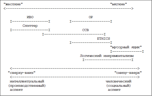 Сюда же может быть наложен континуум интеллектуальный - социальный аспекты проведения изменения. Положение в данном континууме характеризует положение центра тяжести используемого подхода (т.е. на какой аспект изменения направлено большее внимание).