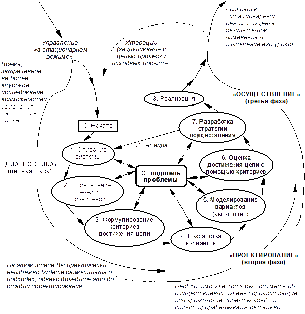 Однако даже такое, достаточно подробное рассмотрение типов проблем, которые вызывают необходимость анализа систем управления предприятием, все же скрывает сами методы, критерии которыми пользуются профессиональные консультанты. Абстрактный ответ на этот вопрос легко позволит получить реконструктивный анализ технологии работы консультантов, а в широком смысле – аналитиков систем управления. Рисунок технологического цикла управленческого консультирования приведен на рисунке (см. Рис. 4)