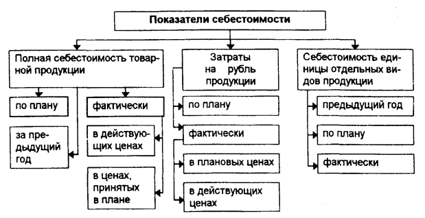 В хозяйственной практике предприятия планируют и учитывают следующие основные показатели себестоимости: полную себестоимость товарной продукции; затраты на рубль товарной продукции; себестоимость единицы изделий. Полная система показателей себестоимости показана на рис. 1.