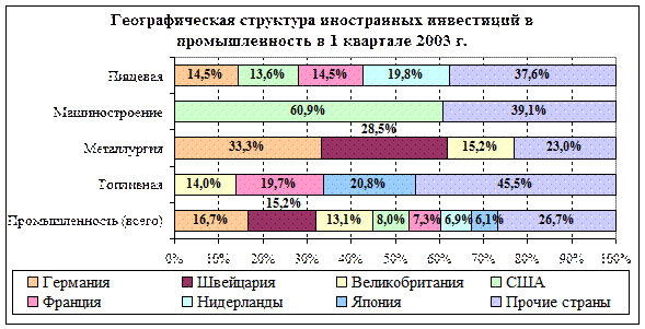 Такой «отраслевой перекос» в значительной мере отражает реальное положение сегодняшней России в международном разделении труда. Страна выступает на мировой экономической сцена, как экспортер сырьевых ресурсов и продуктов первого передела, и как импортер иностранной высокотехнологичной продукции и услуг, рассчитанной в первую очередь на потребительский спрос. В тоже время такая отраслевая структура инвестиций свидетельствует о том, какие категории иностранных инвесторов в первую очередь готовы производить прямые вложения в Россию, невзирая на высокие риски и крайне неблагоприятный инвестиционный климат.