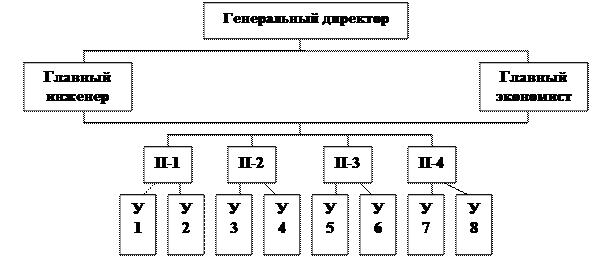 Появление линейно – функциональных структур обусловлено стремлением избежать недостатков, присущих линейным и функциональным структурам. Лине йно – функциональная структура управления получила наибольшее распространение в управлении машиностроительными предприятиями и состоит в том, что линейные руководители осуществляют свою деятельность на принципах единоноличия, но для обеспечения необходимой компетентности управленческих решений при руководстве создаются функциональные подразделения, которые возглавляют ведущие специалисты в определённых областях. Преимуществом такой структуры является повышение качества принимаемых решений и соблюдение принципа единоналичия, а недостатки – в тенденции к увеличению штатов функциональных служб, к их отрыву от проблем, наиболее важных для исполнителей. Ниже приведена схема линейно – функциональной структуры управления.