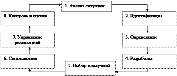 Принятие решения – не одномоментный акт, а результат процесса, имеющего определенную продолжительность и структуру. Процесс принятия решений – циклическая последовательность действий субъекта управления, направленных на разрешение проблем организации и заключающихся в анализе ситуации, генерации альтернатив, выборе из них наилучшей и ее реализации.