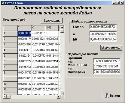 В качестве задачи дипломной работы поставлено изучение методов исследования временных рядов с распределенным лагом и реализация построения модели авторегрессии по методу Койка на ПЭВМ