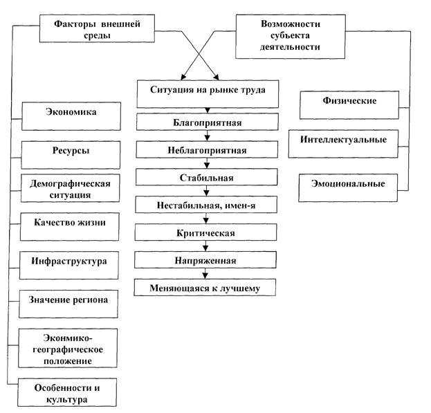 Ситуация на рынке труда. Термин «ситуация» означает обстановку, положение, систему внешних по отношению к субъекту условий и факторов, побуждающих и опосредующих его активность. Любая конкретная ситуация возникает в результате особого сочетания обстоятельств (факторов внешней среды) и собственных возможностей субъекта деятельности.