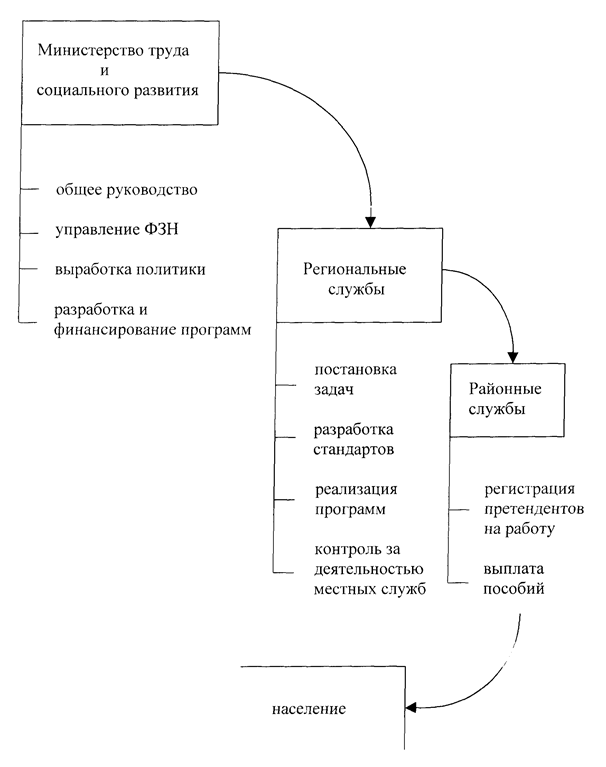 Закон о занятости, принятый в России в 1991 г., дал новое направление политике трудоустройства и изменил структуру службы занятости. Финансирование органов занятости, включая выплату пособий по безработице, осуществляется через ФЗН, источником которого являются поступления из налоговой системы (бюджета)[6].
