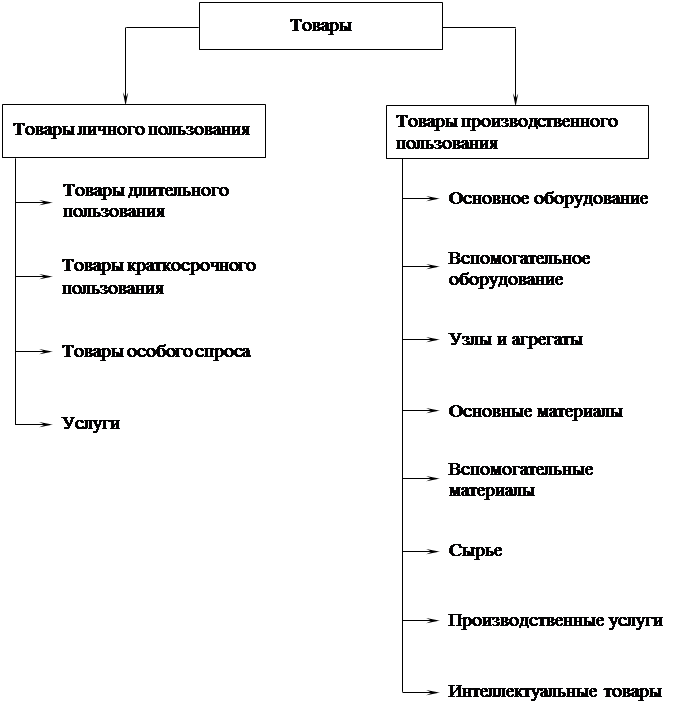 Как видно, все товары подразделяют на товары личного пользования и производственного назначения.