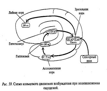 Различные отделы зрительной коры отвечают на разные признаки зрительных объектов. Нейроны-детекторы первичной зрительной коры (VI) реагируют на простые характеристики стимулов, например на определенным образом ориентированную полоску. Нейроны кортикальных областей более высокого порядка отвечают на более сложные признаки (на определенные черты лица). Нейроны области V5 реагируют главным образом на движение зрительного стимула и не отвечают на цвет и форму. В области V4 находят нейроны, отвечающие на цвет и форму предметов, нейроны области 7а — на положение стимула в пространстве относительно головы и тела. Но как возникают целостные зрительныеобразы, сцены, которые мы видим перед собой? Отвечая на этот вопрос, Ф. Крик предположил, что в любой момент определенные нейроны, расположенные в разных кортикальных зонах, могут кооперироваться, чтобы сформировать некоторый вид глобальной активности. Ее появление и соответствует зрительному осознанию.
