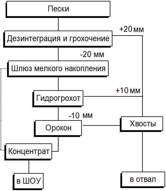 Технологическая схема обогащения песков россыпи реки Хомолхо предусматривает: