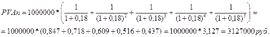 Таким образом, текущая стоимость потока платежей по аннуитету составила 3127000 руб.