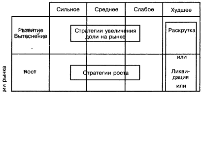 Основное внимание модель Hofer/Schendel [9] сосредотачивает на позиционировании существующих видов бизнеса на матрице развития рынка товаров, определении идеального набора из этих видов бизнеса и разработке путей формирования такого идеального набора. Положение каждого вида бизнеса определяется соответственно степенью развития его рынка и его эффективностью относительно конкурентов. В зависимости от стадии развития рынка товаров могут быть выбраны различные стратегии.[9].
