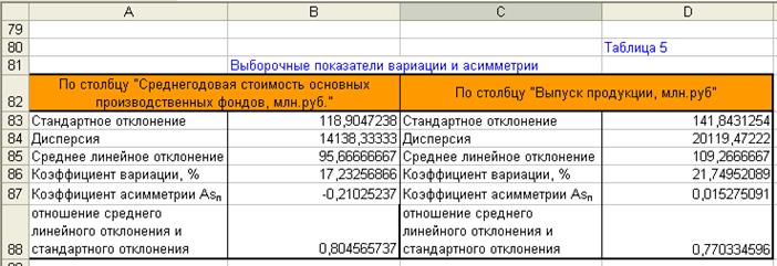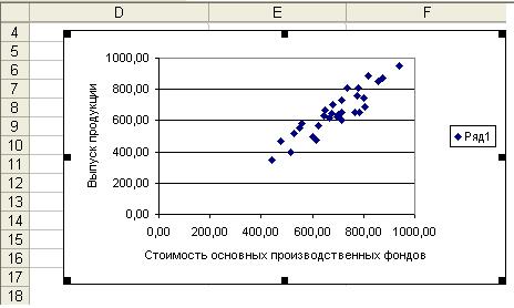 Вывод: Результаты выполнения аналитической группировки предприятий по факторному признаку Среднегодовая стоимость основных производственных фондов даны в табл. 2.2 Рабочего файла, которая показывает, что с увеличением значений факторного признака увеличиваются средние значения результативного признака, что позволяет сделать вывод о наличие корреляционной связи между факторным признаком Х и результативным признаком Y.