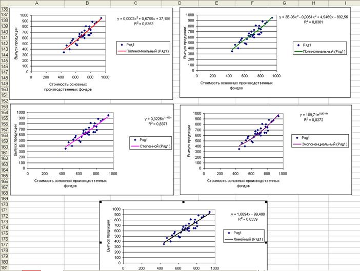 Уравнения регрессии и их графики построены для 4-х видов нелинейной зависимости между признаками и представлены на диаграмме 2.1 Рабочего файла.