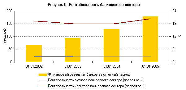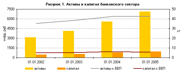 В 2003 – 2005 годах активы банковского сектора выросли в 2,3 раза (с 3160 млрд. руб. до 7137 млрд. руб.), капитал Сбербанка РФ – в 2,1 раза (с 453,9 млрд. руб. до 946,6 млрд. руб.).