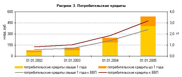 В последние годы сформировался новый сегмент рынка банковских услуг - кредитование населения. Объем потребительских кредитов вырос более чем в 7 раз и достиг 536 млрд. руб.) (см рисунок 3).