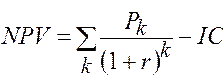 Допустим, делается прогноз, что инвестиция (IC) будет генерировать в течение n лет, годовые доходы в размере Р1, Р2, ... , Рn. Общая накопленная величина дисконтированных доходов (PV) и чистый приведенный эффект (NPV) соответственно рассчитываются по формулам: