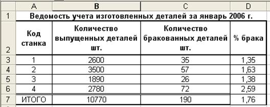 Рис. 4. Расположение таблицы «Ведомость учета изготовленных деталей за январь 2006 г.» на рабочем листе Excel