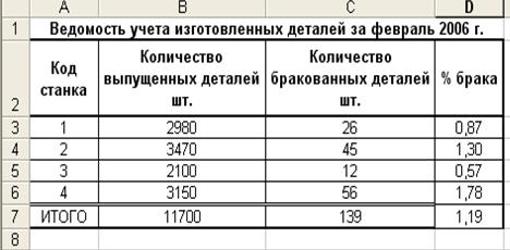 Рис. 5. Расположение таблицы «Ведомость учета изготовленных деталей за февраль 2006 г.» на рабочем листе Excel