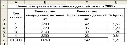 Рис.6. Расположение таблицы «Ведомость учета изготовленных деталей за март 2006 г.» на рабочем листе Excel