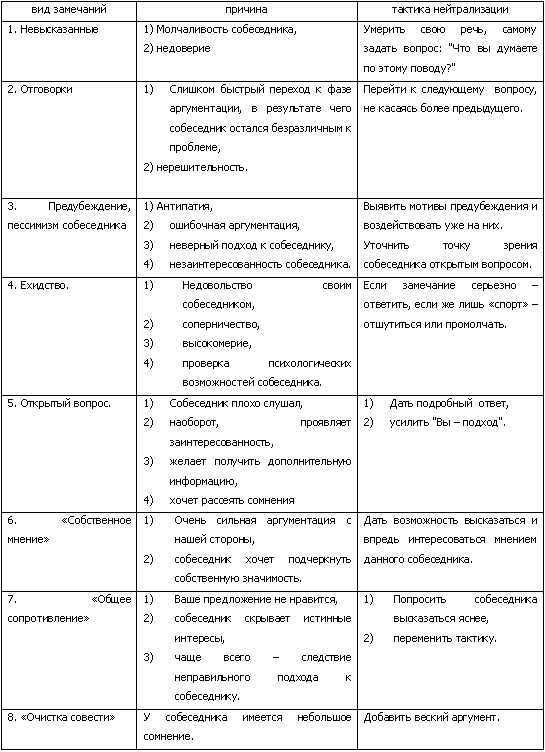 Нейтрализация замечаний собеседника является одним из самых сложных этапов в деловой беседе. Перед сторонами беседы на этом этапе стоят следующие цели: выявить противоречия в речи собеседника; оспорить (если это необходимо и возможно) приведенные собеседником факты; убедиться, что заключение собеседника не ошибочно; показать другую сторону проблемы.