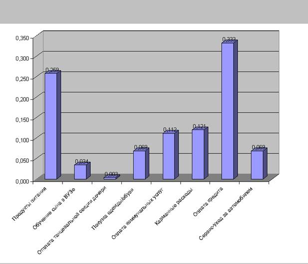 Рассчитать чистую семейную прибыль на окончание месяца. Высчитать процентную долю каждого вида затрат от общей суммы затрат в процентах. Обнаружить по расчетам самую убыльную часть оплаты разного вида услуг. Как изменится чистая прибыль семьи при повышении заработной платы отца на 11000 руб./мес. и поступлении дочери в ВУЗ с оплатой обучения 36000 руб./год?