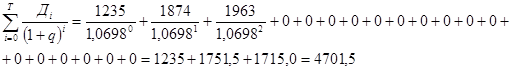 Вспомним, что в рассматриваемом примере показатель внутренней нормы доходности составляет q = 0,0698. Если норматив дисконтирования при расчете будет принят на уровне внутренней нормы доходности, т.е. равным 0,0698, то чистый приведенный доход в этом случае будет равен нулю. Это значит, что сверх установленного норматива предприятие никакого дохода не получит.