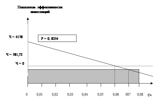 Теперь обратим внимание на горизонтальную линию с нулевым чистым приведенным доходом. Если норматив дисконтирования будет больше величины 0,0698, то чистый приведенный доход окажется величиной отрицательной и попадет на рассматриваемом графике в затемненную зону (например, при нормативе qн = 0,08).