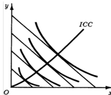 С ростом дохода спрос на товар Х насыщается, а почти все приращение дохода уходит на товар У. Эта зависимость видна на линии доход-потребление (рис. 1).