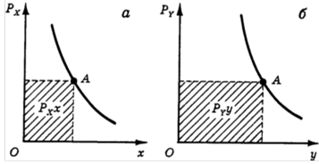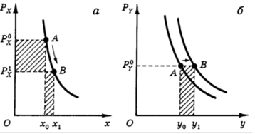 Потребитель находится в точке А, покупая в единицу времени x0 товара Х по цене и y0 товара Y по цене. Когда цена Х внезапно падает, у потребителя появляется лишняя сумма денег, которой он может распорядиться. Этот выигрыш потребителя не зависит от формы кривой спроса, он полностью определяется исходным объемом потребления и величиной падения цены. Кривая спроса показывает, как он распределит высвободившуюся сумму (рис. 5, а). Потребитель увеличивает расходы на товар X, переходя по кривой спроса из точки А в точку В. Заштрихованные площади на рис. 5, а показывают уменьшение расходов из-за снижения цены и их увеличение, связанное с покупкой дополнительного количества товара Х.