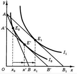 Рассмотрим теперь переход от точки вспомогательного оптимума E` к точке нового оптимума Е1. Оба эта оптимума характеризуются одинаковым соотношением цен товаров, и, следовательно, изменение объема спроса на товар X происходит исключительно вследствие увеличения реального дохода. Тогда очевидно что увеличение объема спроса x1 - x` - не что иное, как эффект дохода.