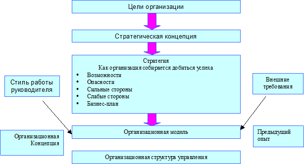 Под структурой управления понимается упорядоченная совокупность устойчиво взаимосвязанных элементов, обеспечивающих функционирование и развитие организации как единого целого. ОСУ определяется также как форма разделения и кооперации управленческой деятельности, в рамках которой осуществляется процесс управления по соответствующим функциям, направленным на решение поставленных задач и достижение намеченных целей.[1] С этих позиций структура управления представляется в виде системы оптимального распределения функциональных обязанностей, прав и ответственности, порядка и форм взаимодействия между входящими в ее состав органами управления и работающими в них людьми.