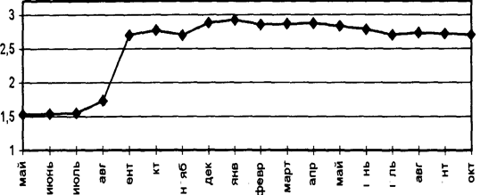 Рис. 3 Отношение текущего курса рубля к паритету покупательной способности с мая 1998 г по октябрь 1999 г