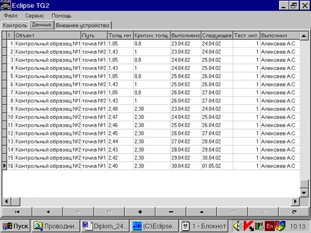 Для иллюстрации изложенных выше принципов построения СОБ, мною была написана программа Eclipse TG2. В структурной иерархии СОБ данная программа является ЛСХД с элементами ЦСХД. Программа предназначена для считывания данных тестирования с УЗК дефектоскопов и толщиномеров компании NDT Systems. Дефектоскопы серии Quantum и толщиномеры серии Nova и Eclipse, этой компании, являются многофункциональными приборами предназначенными для широкого спектра дефектоскопических исследований. Приборы имеют сходный протокол передачи данных на ПК через интерфейс RS-232, поэтому программа может работать с приборами всех указанных серий. В своей работе я использовал толщиномер модели Eclipse TG2.