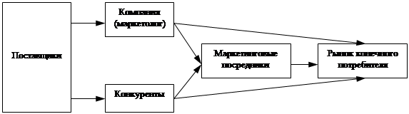 На рис. 1.1 показаны основные элементы системы современного маркетинга. В стандартной ситуации маркетинг подразумевает обслуживание рынка конечных потребителей в условиях наличия конкуренции. Компания и ее конкуренты отправляют производимую ими продукцию и информацию о ней конечным потребителям – напрямую или через маркетинговые промежуточные звенья (посредников). На все действующие лица этой системы оказывают влияние одни и те же факторы окружающей среды (демографические, экономические, экологические, научно-технические, политико-правовые, социально-культурные). Каждая из составляющих системы маркетинга вносит свой вклад в создание потребительской ценности. Таким образом, успех компании зависит не только от ее собственных действий, но и от того, насколько хорошо нужды конечного потребителя удовлетворяются всеми звеньями цепи.
