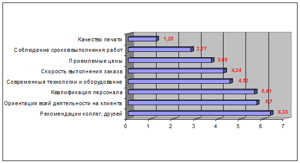 § Качество печати играет решающую роль при выборе компании, при этом очень важно соблюдение сроков выполнения заказа. Рекомендации коллег, друзей, предыдущий опыт работы и ориентация всей деятельности на клиента оказывают меньшее влияние на выбор компании, предоставляющей услуги рекламной полиграфии (см. рис. А.3).