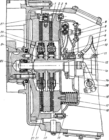 1- ведомый диск; 2- ведущий диск; 3- установочная втулка; 4- нажимной диск; 5-вилка оттяжного рычага; 6- оттяжной рычаг: 7-пружина упорного кольца; 8-шланг смазывания муфты; 9-петля пружины; 10-выжимной подшипник; 11-оттяжная пружина; 12-муфта выключения сцепления; 13- вилка выключения сцепления; 14- упорное кольцо; 15- вал вилки; 16- нажимная пружина; 17- кожух; 18-теплоизолирующая шайба; 19- болт крепления кожуха; 20- картер сцепления; 21-маховик; 22-фрикционная закладка; 23- первичный вал; 24- диск гасителя крутильных колебаний; 25- пружина гасителя крутильных колебаний; 26-кольцо ведомого диска; 27-механизм автоматической регулировки положения среднего ведущего диска