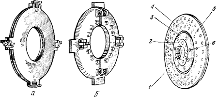 Средний ведущий диск (рис. 1.3, а) отлит из чугуна и установлен в пазах маховика на четырех шипах, равномерно расположенных по окружности диска. Для обеспечения вентиляции сцепления, лучшего отвода тепла и снижения веса в теле диска выполнены окна, разделенные между собой внутренними ребрами. В шипах размещен рычажный механизм, который механически регулирует положение среднего диска при выключении сцепления с целью обеспечения чистоты выключения.