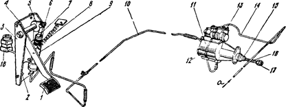 Механизм выключения состоит из четырех оттяжных рычагов, упорного кольца, муфты выключения сцепления с выжимным подшипником, вилки выключения сцепления с валом, двух оттяжных пружин.